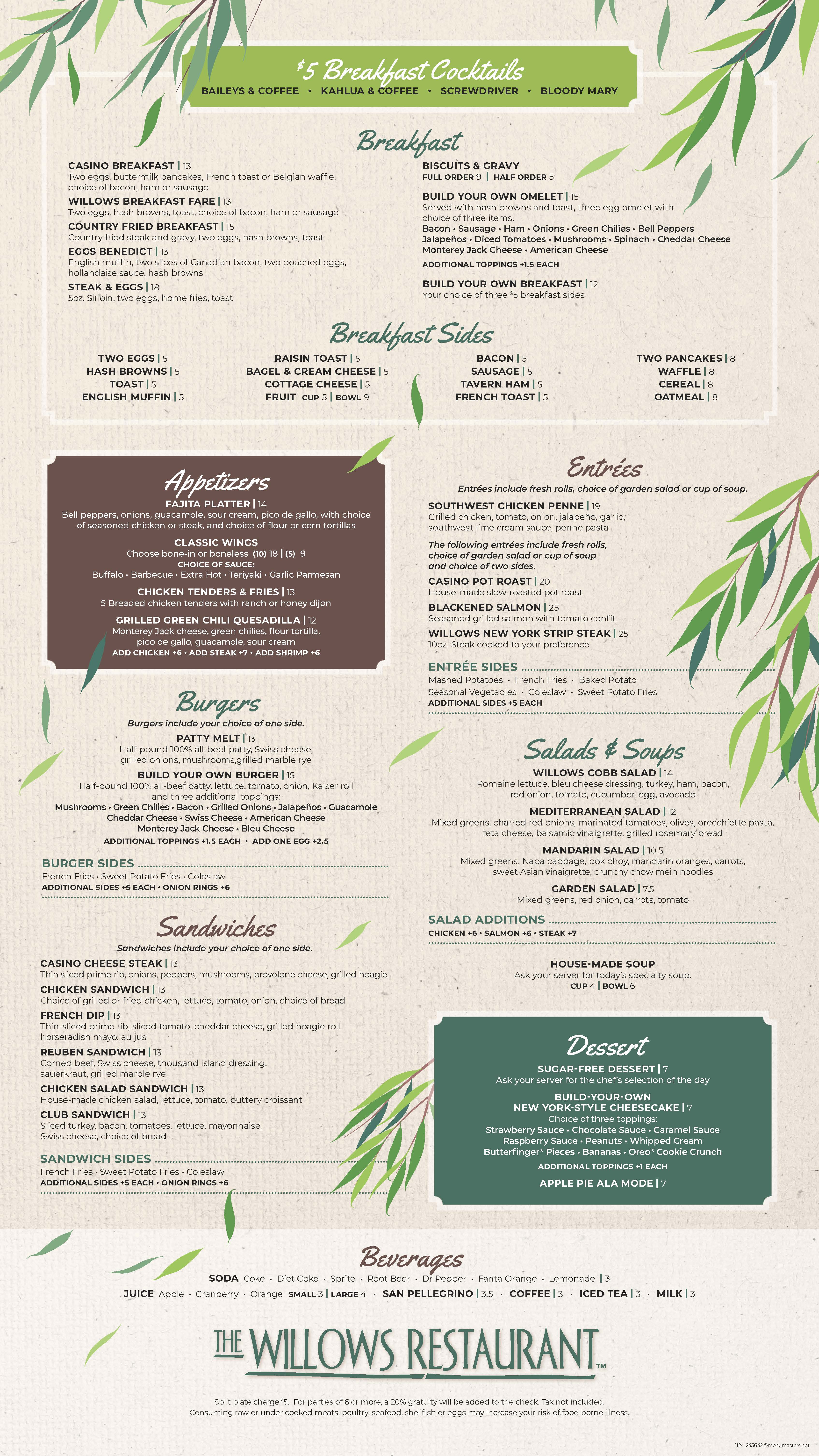 The Willows is the perfect casual dining spot for a quick business lunch or dinner, a hearty morning breakfast, or just for meeting up with friends.